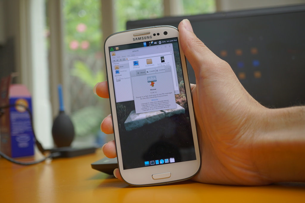 postmarketOS + xfce4 on the Galaxy S III (1/2)6th June 2023 Other image sizes: 800px | 1024px | 1440px Here's a photo I took of the Galaxy S III running postmarketOS v22.12, when I had it installed with the Xfce desktop environment. It is definitely quite small on the display, but it does work pretty well on this regardless! |