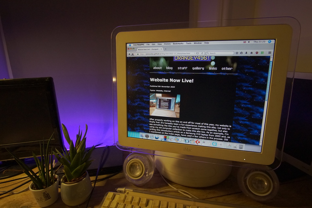 Orangey456 website on an iMac G410th November 2022 Other image sizes: 800px | 1024px | 1440px ...and here's a photo I originally took to use in the announcement post for my website, with the first blog post being displayed on my iMac G4, one of my favourite computers in my collection. |